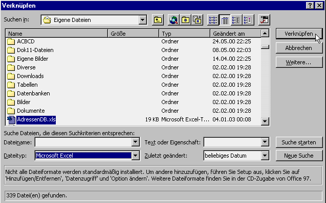 dem die richtige Datei gesucht werden kann. Dazu muß unten links der Dateityp Microsoft Excel ausgewählt werden. Danach