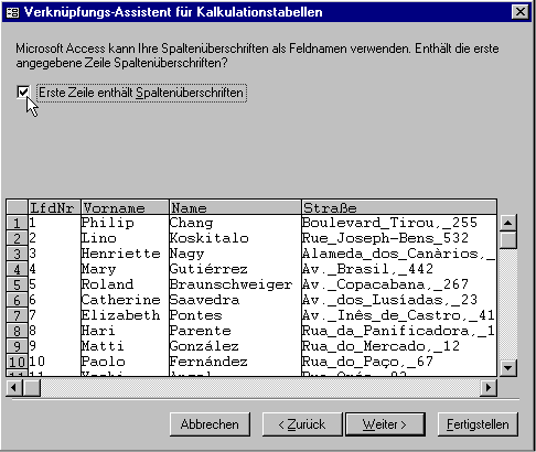 So sieht die nächste Seite aus. Dort wird oben Erste Zeile Enthält Spaltenüberschriften selektiert.