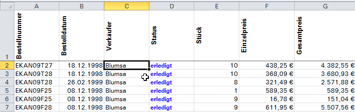 Zunächst wird die Tabelle nach dem Begriff sortiert, der die Grundlage für die Gruppierung der Tabelle bildet. In meinem Beipiel ist das die Spalte Verkäufer. Anschließend wird eine beliebige Zelle in der Tabelle selektiert.