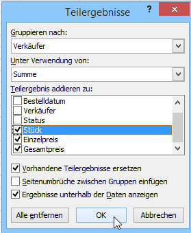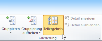 Der Aufruf erfolgt über den Reiter Daten / Gliederung / Teilergebnisse Es öffnet sich das nachfolgende Fenster: