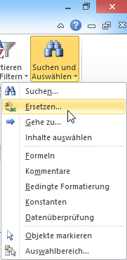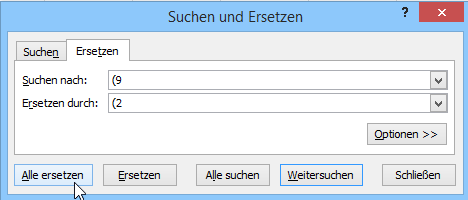 Zunächst einmal mußte ich aber die Summen hinnehmen. Danach habe ich dann die entsprechende Spalte (in diesem Fall Spalte E) selektiert und unter Start / Bearbeiten / Suchen und Auswählen / Ersetzen folgende Eingaben getätigt: