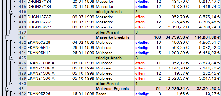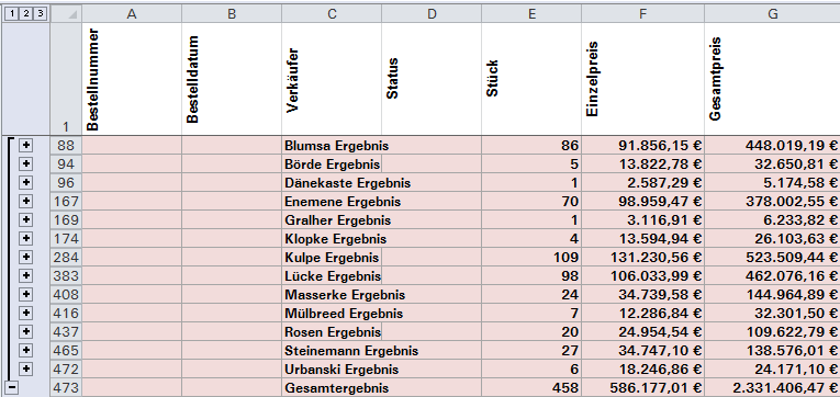 Wie man unschwer erkennen kann, wurde den "alten" Teilergebnissen ein neues zugefügt, das die erledigten und offenen Vorgänge je Verkäufer in ihrer Anzahl darstellt. Die Bedingte Formatierung habe ich gleich mit eingebaut. Das Verfahren ist das gleiche wie beim ersten Mal. Deshalb gehe ich darauf nicht weiter ein. Die Gliederungsebenen am linken Rand haben sich um eine Ebene erweitert.