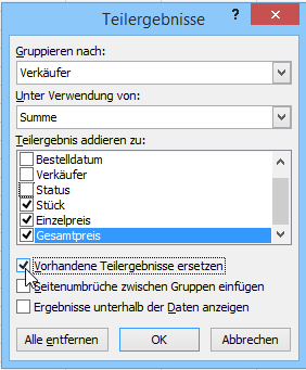 Zunächst betrachten wir noch mal die Dialogbox Teilergebnisse, die wir ja schon ganz zu Anfang kennen gelernt haben. Dort befinden sich am unteren Rand drei Kontrollkästchen mit der jeweils zugehörigen Beschriftung. Das erste Kontrollkästchen hat die Beschreibung Vorhandene Teilergebnisse ersetzen. Stellt sich also die Frage, was passiert, wenn diese Option nicht gesetzt ist?