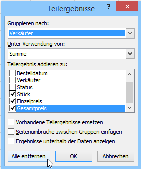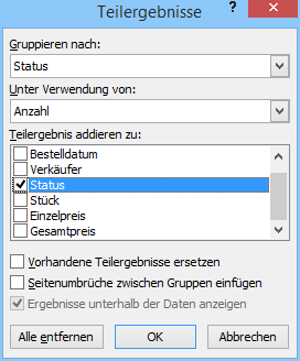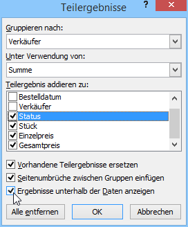 Danach sortieren wir die Liste erstrangig nach den Verkäufern und zweitrangig nach der Spalte Status. Danach wiederholen wir die Anfangs durchgeführte Prozedur zum Erzeugen der Teilergebnisse. Wenn das durchgeführt ist, ändern wir die Parameter in der Dialogbox, so wie es auf dem nächsten Bild zu sehen ist.