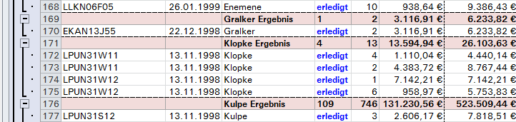 Am linken Rand der Tabelle ist eine graue Leiste mit einigen kleinen Schaltflächen entstanden. Wir wollen uns hier kurz mit den Schaltflächen ganz oben, erkennbar durch die Zahlen 1 bis 3 beschäftigen. Drückt man auf die Schaltfäche 1, wird die gesamte Tabelle "versteckt", man sieht nur noch das Gesamtergebnis aus den Teilergebnissen. Drückt man auf die Schaltfläche mit der 2, bekommt man alle Teilergebnisse und die Gesamtsumme(n) angezeigt. Ein Druck auf die Schaltfläche 3 entfaltet die Tabelle wieder zu ihrer vollen Größe.