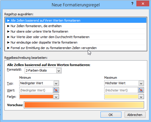 Nach dem Klick auf die OK-Schaltfläche öffnet sich die schon bekannte Dialogbox Neue Formatierungsregel, dort können wir jetzt eine Vorschau der