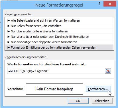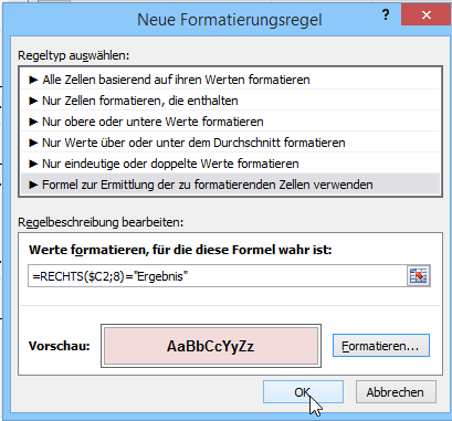 In der folgenden Dialogbox wird im Eingabefeld die Formel =RECHTS($C2;8)="Ergebnis" eingetragen. Wichtig ist dabei das Dollarzeichen ($) vor dem