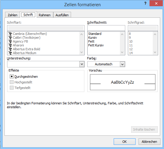 Über die Schaltfläche Formatieren... gelangen wir in die Dialogbox Zellen formatieren. Dort können allen nicht ausgegrauten Formate für die zu