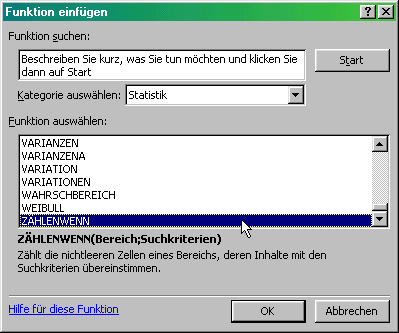 Wie alle Standardfunktionen kann man sie über den Funktionsassistenten aufrufen. Wir finden sie in der Kategorie Statistik.