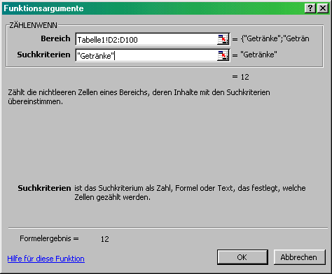 =ZÄHLENWENN(Tabelle1!D$2:D$100;"Getränke")