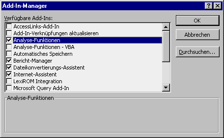 Mit einem Datum lassen sich verschiedene Berechnungen durchführen, sie müssen nur mit der seriellen Zahl, aus der das Datum in Wahrheit besteht, in Einklang gebracht werden und irgend einen Sinn ergeben. Es gibt noch eine Reihe von speziellen Möglichkeiten, die in der Standardinstallation nicht unmittelbar zur Verfügung stehen. Sie sind aber sicher von Interesse, deshalb gehe ich darauf ein. Zunächst müssen wir dazu den Add-Inn-Manager unter Extras aufrufen.