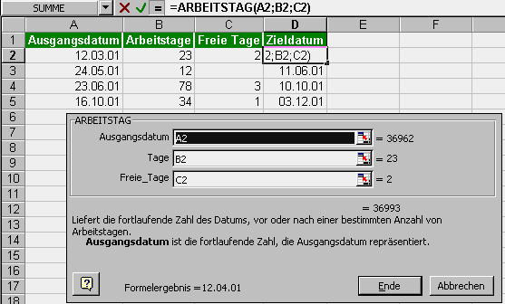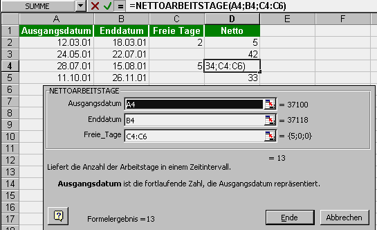 Diese Funktion erlaubt es die Zahl von Arbeitstagen zwischen zwei Terminen, unter Berücksichtigung von freien Tagen, zu berechnen.
