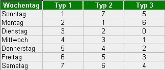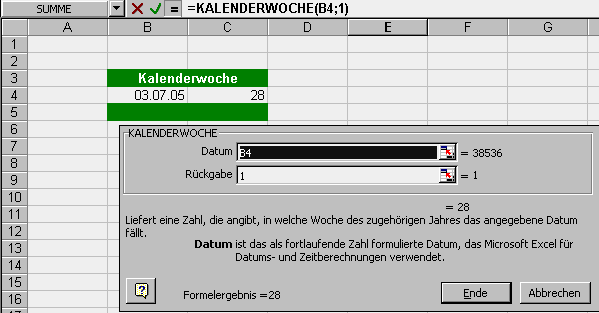 Dieses Beispiel ist auf der Beispieltabelle im Downloadbereich. In Zelle B4 kann ein Datum eingegeben werden in Zelle C4 wird die Kalenderwoche angezeigt. Unter Rückgabe wird ein Wert von 1 bis 3 eingegeben (laut Assistent) der Wert 3 verursachte bei mir einen Fehler. Die Bedeutung dieses Wertes kann aus der nächsten Tabelle entnommen werden. Er legt fest, mit welchem Tag die Woche beginnt.